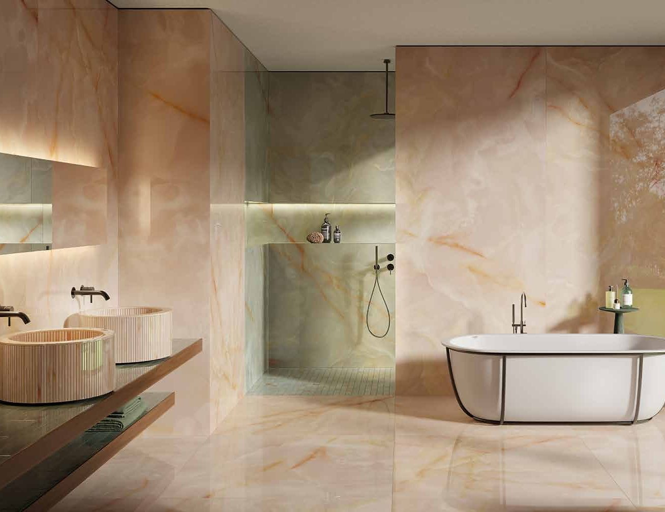 Gresie Portelanata Gemme . FAP Ceramiche prezintă noile plăci GEMME cu efect de onix. O omagiere a luminii care devine un dispozitiv arhitectural pentru reflectarea și multiplicarea frumuseții: aceasta este esența GEMME, noua serie de plăci din gresie porțelanată cu efect de onix de la FAP Ceramiche, care eliberează o frumusețe atemporală. O emblemă a frumuseții lichide, cu pereți și podele care reflectă lumină armonios, GEMME este o colecție potrivită atât pentru spații rezidențiale, cât și pentru cele comerciale, pentru a crea propriul tău stil inconfundabil.