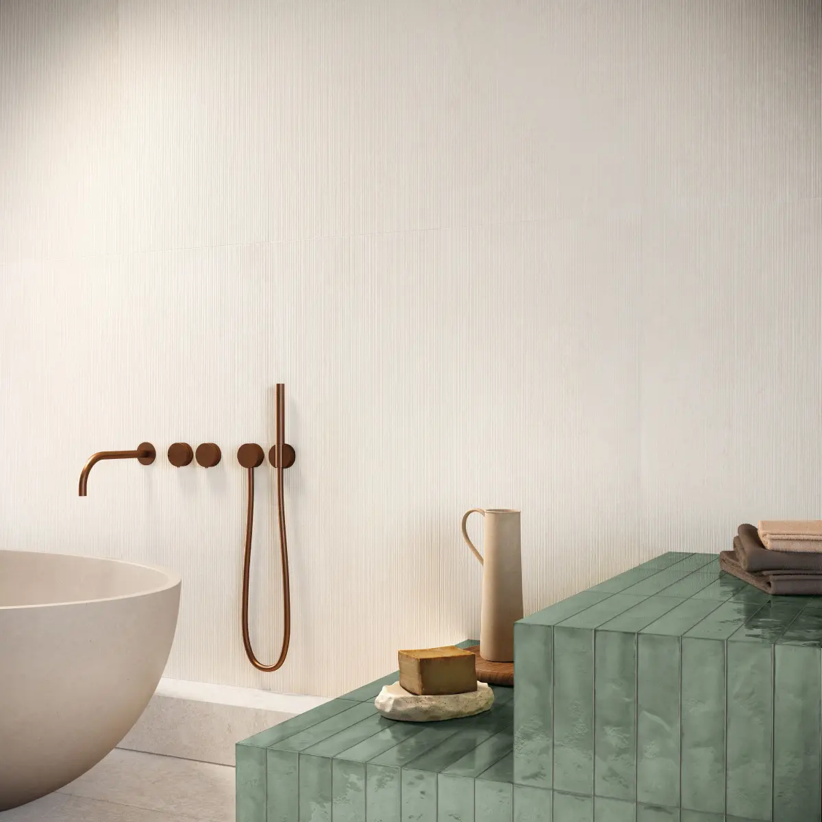 Bricksy se combină perfect cu colecții cu efect de marmură, lemn, ciment sau piatră, conturând interioare coerente, echilibrate și extrem de actuale.