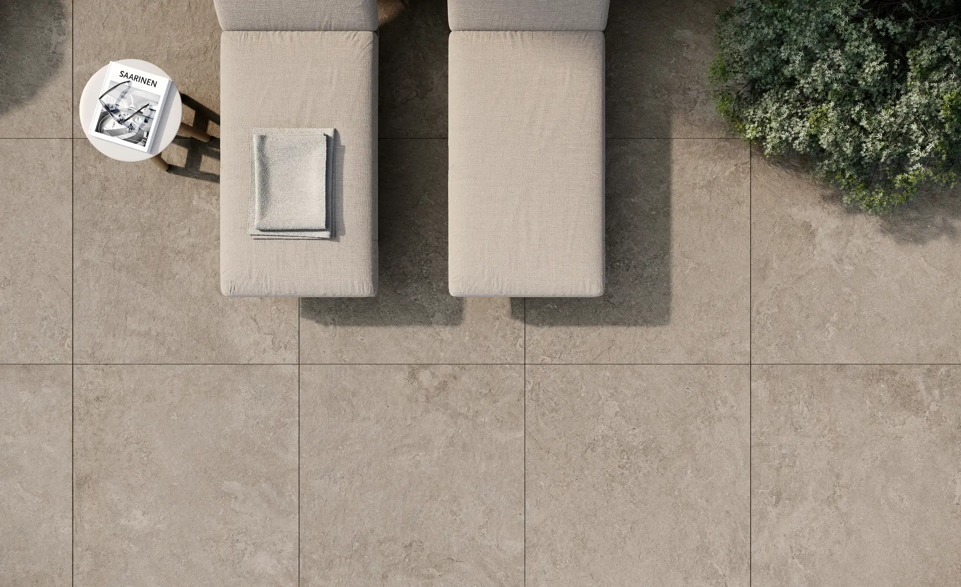 Living cu Gresie Porțelanată Dusk. Gresia porțelanată utilizată în living-ul din imagine este concepută ca o suprafață arhitecturală continuă. Un limbaj estetic inspirat din piatra naturală și din mineralitatea brută a materialelor geologice. Cromatica gresie este profundă și echilibrată, în nuanțe de gri mineral, cenușiu cald și tonuri ușor antracit. Gresia Dusk prezintă variații grafice naturale care conferă autenticitate și profunzime vizuală fără a crea aglomerație decorativă. Textura mată, fin structurată, oferă un aspect sofisticat, contemporan și o senzație tactilă naturală, apropiată de piatra reală. Formatul mare al plăcilor creează continuitate vizuală și fluiditate, eliminând fragmentarea și susținând un concept arhitectural coerent între interior și exterior. Estetic, această gresie transmite un stil contemporan, natural și premium, transformând orice spațiu exterior într-o extensie elegantă și sofisticată a locuinței.