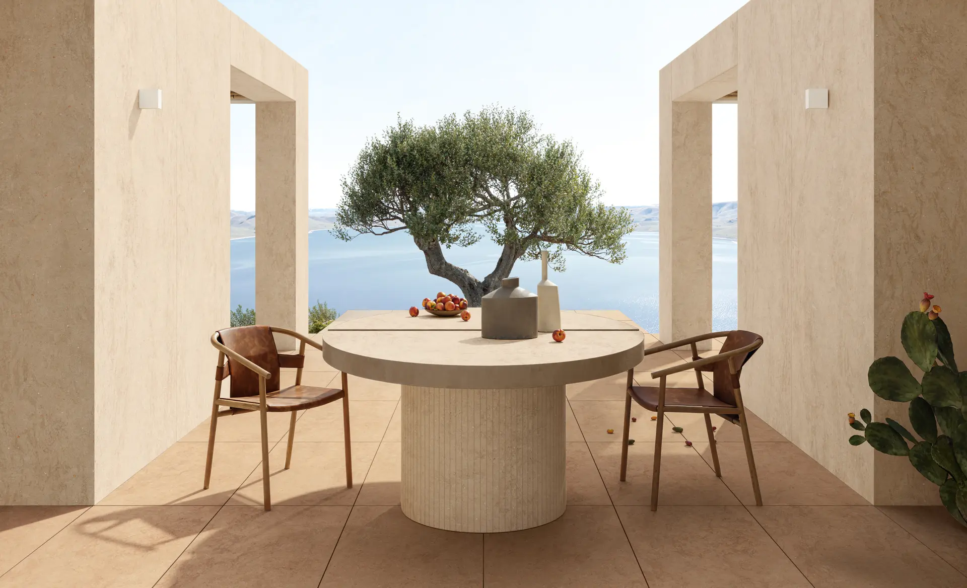 Terasa cu Gresie de Exterior Canve. Gresia pentru exterior din imagine creează o atmosferă arhitecturală echilibrată și profund mediteraneană. Gresia portelanata Canve devine parte integrantă din conceptul de design. Suprafața ceramică, în nuanțe calde de nisip și bej natural, reproduce cu mare fidelitate textura pietrei naturale. Gresia portelanata Canve prezinta variații cromatice subtile și o granulație fină care adaugă profunzime vizuală fără a încărca spațiul. Finisajul mat conferă eleganță și naturalețe, eliminând reflexiile dure și oferind o senzație tactilă plăcută, ideală pentru spații exterioare. Plăcile de mari dimensiuni amplifică percepția de continuitate și ordine, creând un fundal calm. Din punct de vedere funcțional, această gresie este perfect adaptată utilizării outdoor: rezistentă la uzură, variații de temperatură, umiditate și trafic, fiind o soluție premium pentru terase. Gresie rezistentă produsă în Italia.