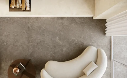 Living cu Gresie Pura Sassi. Amenajarea evidențiază gresia porțelanată Materia Pura Sassi, cu finisaj mat și aspect mineral, inspirat de piatra naturală. Inserțiile discrete tip „sassi” adaugă profunzime și un caracter autentic pardoselii. Datorită plăcilor rectificate, suprafața este continuă și elegantă, ideală pentru un living modern. Descoperă detalii despre colecția de gresie și faianță Materia Pura.