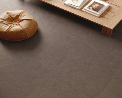 Living cu Gresie Pura Sassi. Amenajarea evidențiază gresia porțelanată Materia Pura Sassi, cu finisaj mat și aspect mineral, inspirat de piatra naturală. Inserțiile discrete tip „sassi” adaugă profunzime și un caracter autentic pardoselii. Datorită plăcilor rectificate, suprafața este continuă și elegantă, ideală pentru un living modern. Descoperă detalii despre colecția de gresie și faianță Materia Pura.